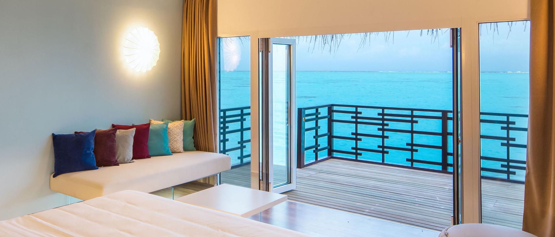 Водные виллы. Спальня с кроватью king-size, небольшая зона отдыха с диваном, ванная комната с душем, терраса с шезлонгами и прямым спуском в воду.
